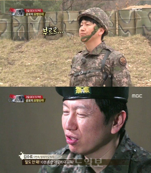 지난 12일 방송된 MBC ‘일밤 진짜 사나이’에는 김수로, 류수영, 서경석, 샘 해밍턴, 서진영, 미르 등 여섯 멤버가 강원도 인제군에 있는 산악포병여단 화룡대대에 전입해 포병 숫자와 수신호 교육을 받았다.