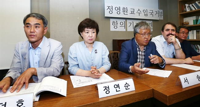 (서울=연합뉴스) 이재희 기자 = 1일 오전 서울 종로구 푸른교육아카데미에서 열린 정영환 메이지가쿠인대 교수 입국거부 항의 기자회견에서 서승 교수가 발언하고 있다. 왼쪽부터 배덕호 지구촌동포연대 대표, 정연순 민주사회를위한변호사모임 대표, 서승 리츠메이칸대 교수, 박노자 오슬로대 교수, 김창록 경북대 법학전문대학원 교수. '제국의 위안부(박유하 교수 저)'를 비판한 책인 '누구를 위한 화해인가'의 저자 정영환 교수는 '조선적' 재일조선인 3세로 입국이 불허된 상태다. 2016.7.1