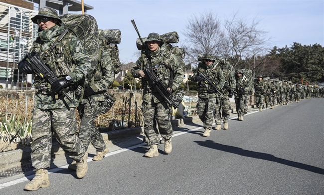 (서울=연합뉴스) 해병대 1사단 수색대대 장병들이 26일 강원도 황병산 일대에서 한미 연합 동계 전술훈련을 마친 뒤 경북 포항 부대까지 439km에 달하는 거리를 장거리 전술무장행군(천리행군)으로 복귀하고 있다. 2017.1.26 [해병대 1사단 제공=연합뉴스]
